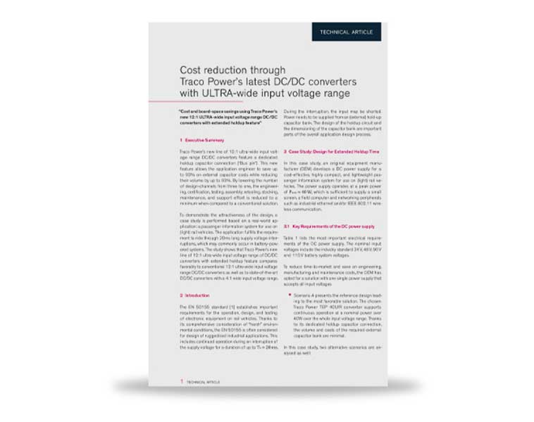Traco Power's ULTRA-wide products come with an industry-leading dedicated holdup capacitor connection. Using this feature, system designers can substantially reduce the size, costs, and weight of an external capacitor bank in all applications where extended holdup-time requirements need to be met. Say goodbye to bulky, costly, high-voltage input capacitors!